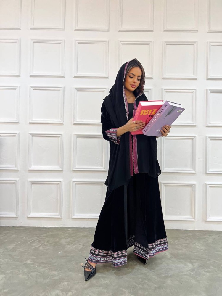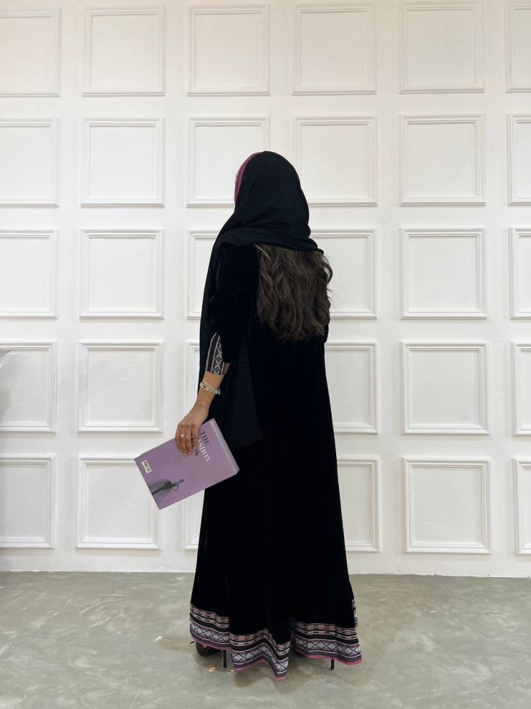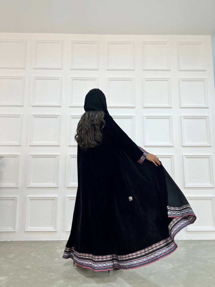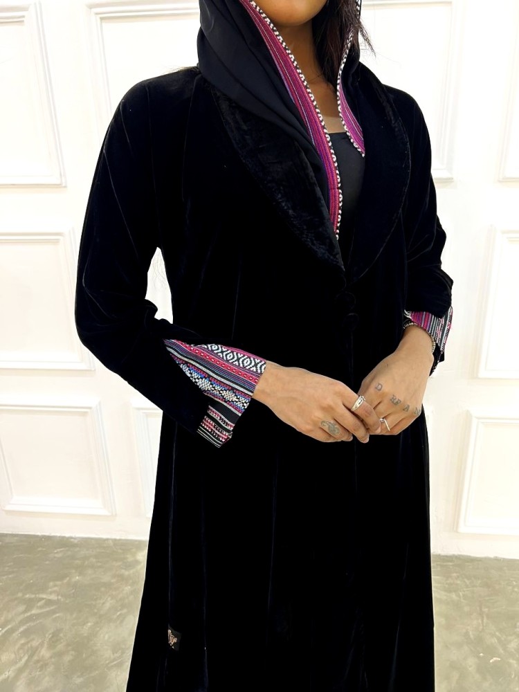 عباية شتوية مخمل اسود مع تخريج نقش ملون على اطراف الأكمام وفي اسفل العباية والقصة نص كلوش