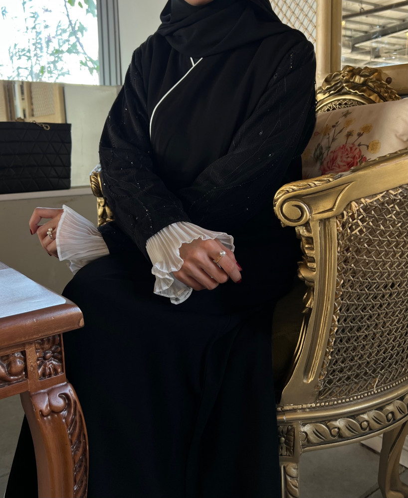 عباية نص كلوش بقماش الكريب الملكي وتطريز تل على الاكمام ولمسه انيقة بالابيض المكسر على اطراف الاكمام