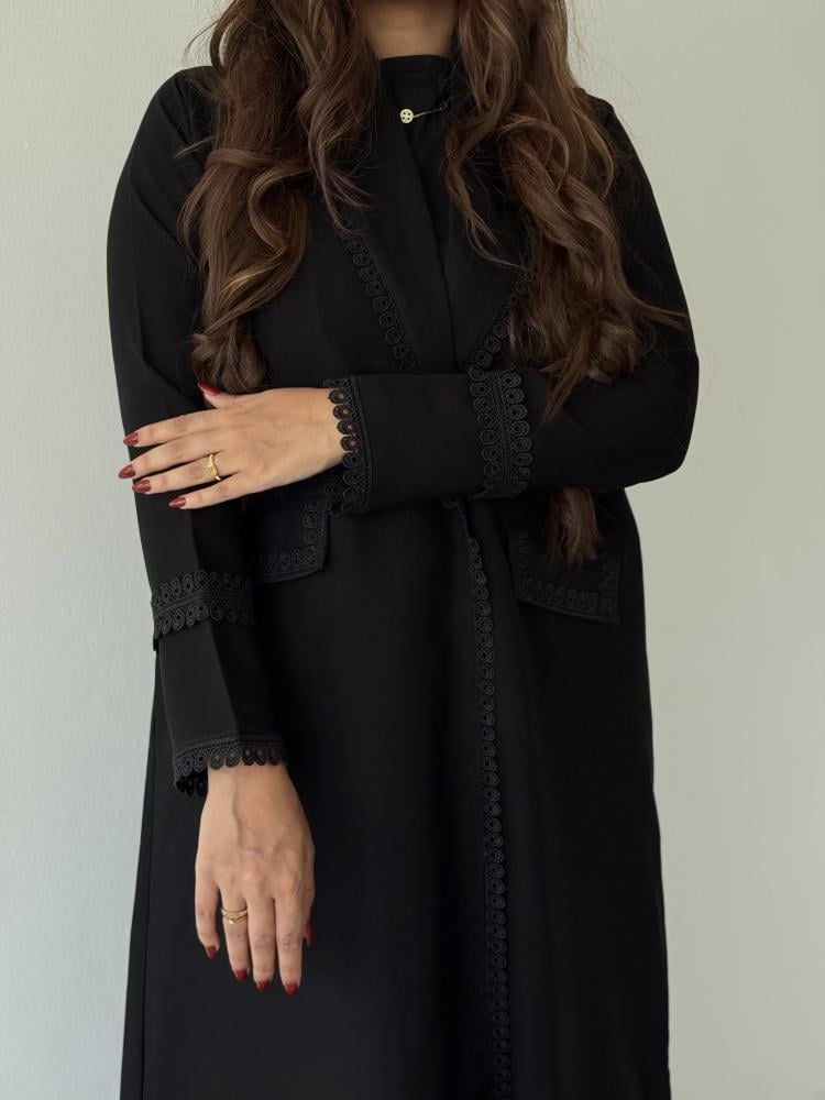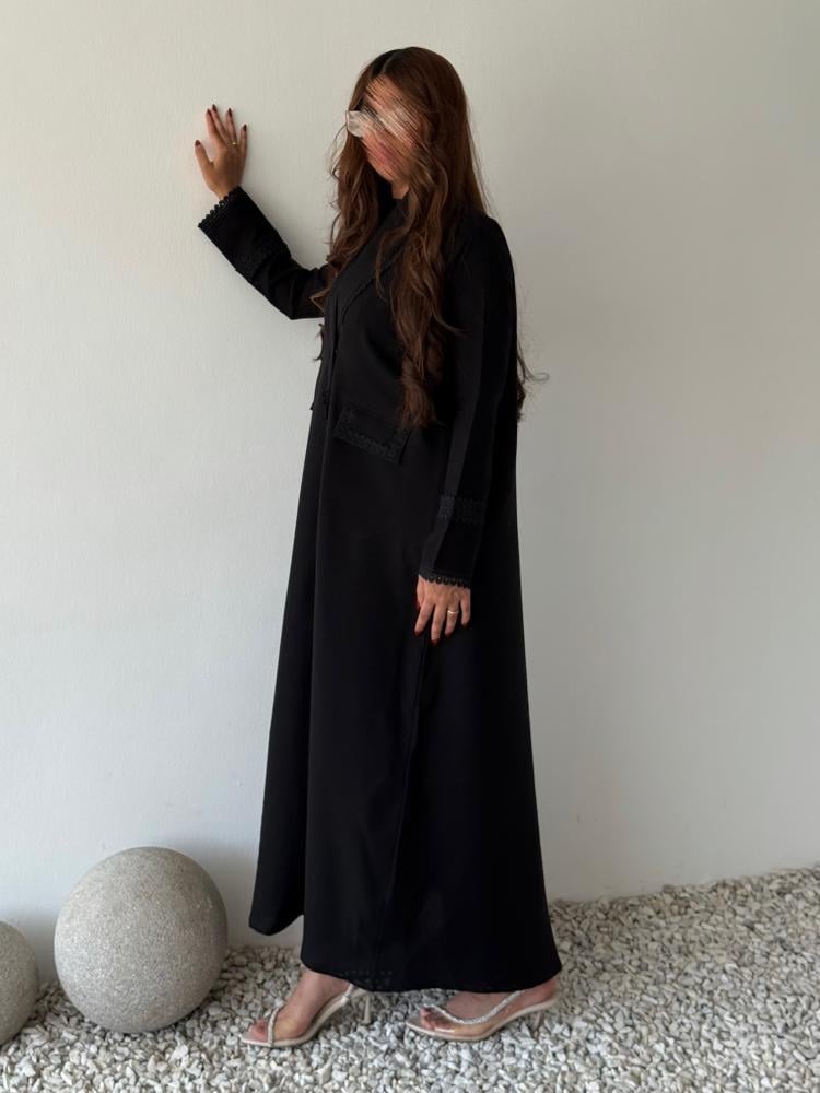 القماش كريب اسود واقف مع تخريج بالتطريز الأسود على الأكمام والياقة مع وجود طقطق في الجانب ومناسبة للجميع