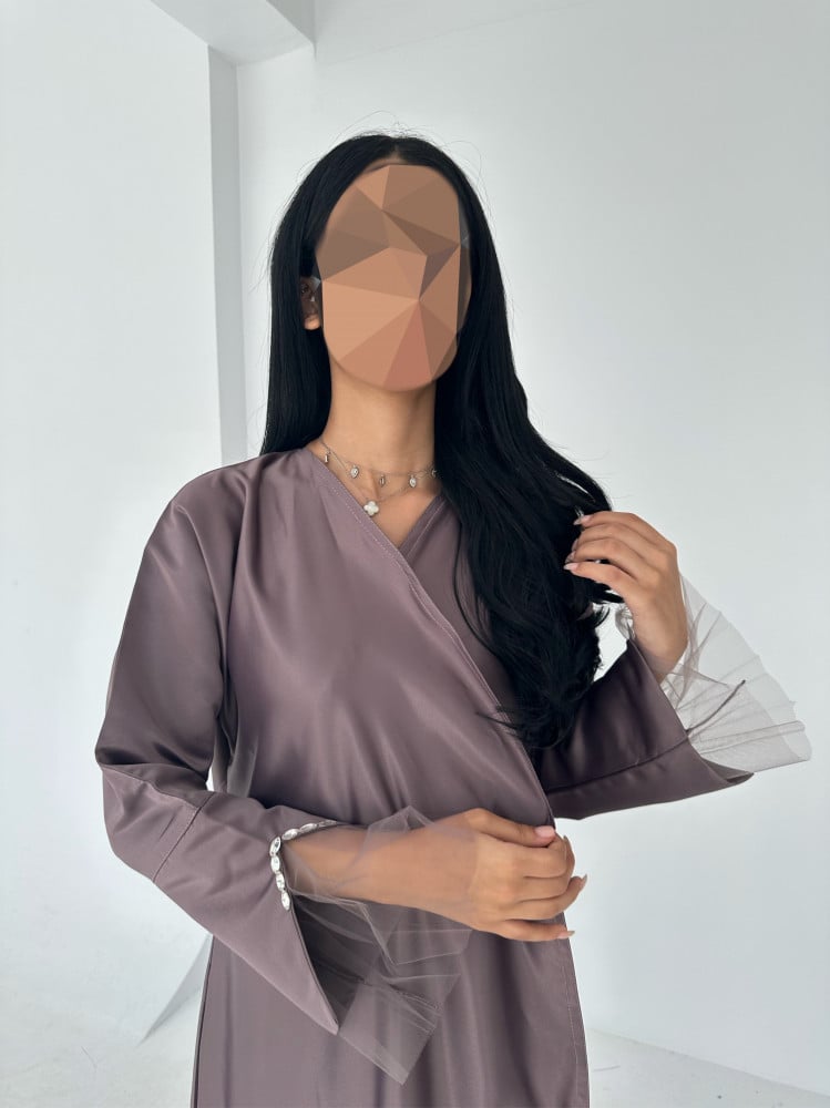 عباية تفته موكا القصة نصف كلوش وعلى مقدمة الأكمام تل وتطريز كريستال