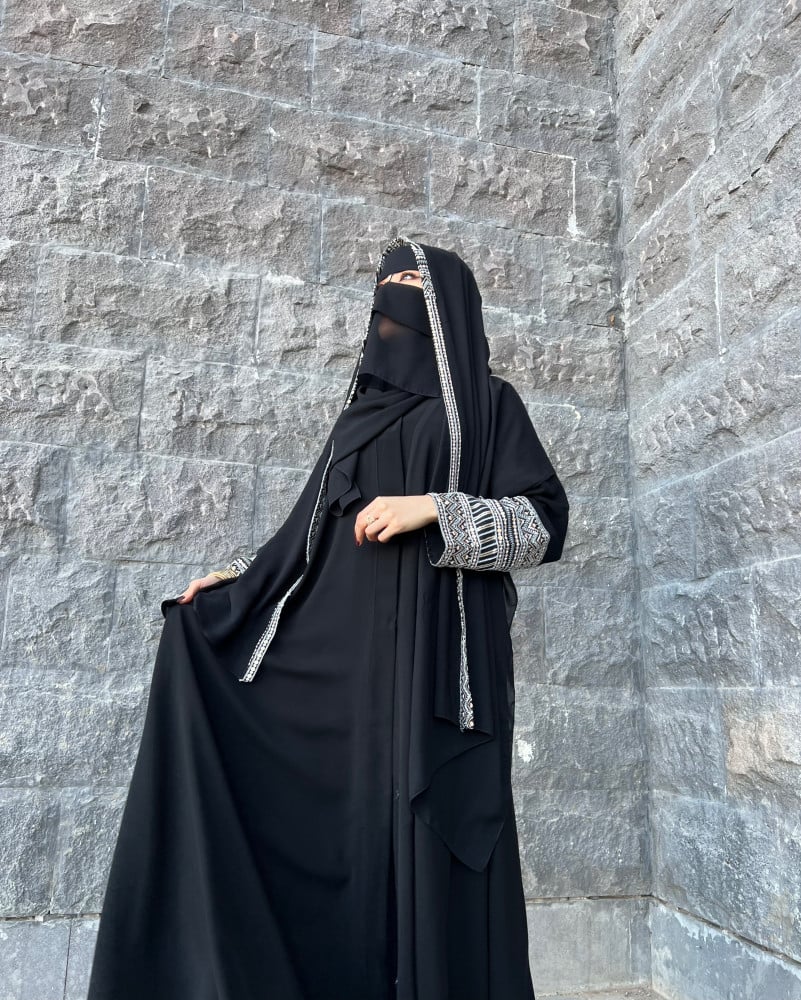 عباية بقماش الكريب الملكي والقصة نص كلوش وتطريز أنيق على اطراف الكم